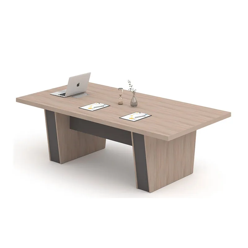 Особенности дизайна: Основной принцип — простой и элегантный дизайн с чистыми и плавными линиями, что позволяет избежать чрезмерно сложных декоративных элементов, нарушающих атмосферу общения. Столешница доступна в прямоугольном, овальном или круглом исполнении: прямоугольная форма подходит для официальных деловых переговоров, овальная форма улучшает пространственное взаимодействие, а круглая форма способствует равноправному общению, адаптируясь к различным сценариям общения. Конструкция опорной конструкции: Небольшие столы используют четырёхстоечную или Х-образную опорную конструкцию. Столы среднего и большого размера часто используют утолщённые ножки из массива дерева или металлический каркас в сочетании с массивом дерева. Каждая ножка выдерживает нагрузку 150 кг и более, а весь стол выдерживает нагрузку более 500 кг, обеспечивая устойчивость и отсутствие шатания, когда на него опираются несколько человек или ставят на него оборудование.